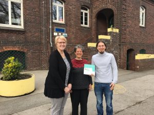 Foto: Dr. Antje Baumann, BiSS-Akademie NRW (Mitte) überreicht die Plakette des Forschungsnetzwerkes BiSS-Transfer an Anette Ahlmann-Spoo und Martin Gerste, Schulleiter der Barbaraschule.